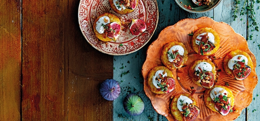 Röstirondjes met geklopte ricotta, vijgen en parmahamkruim