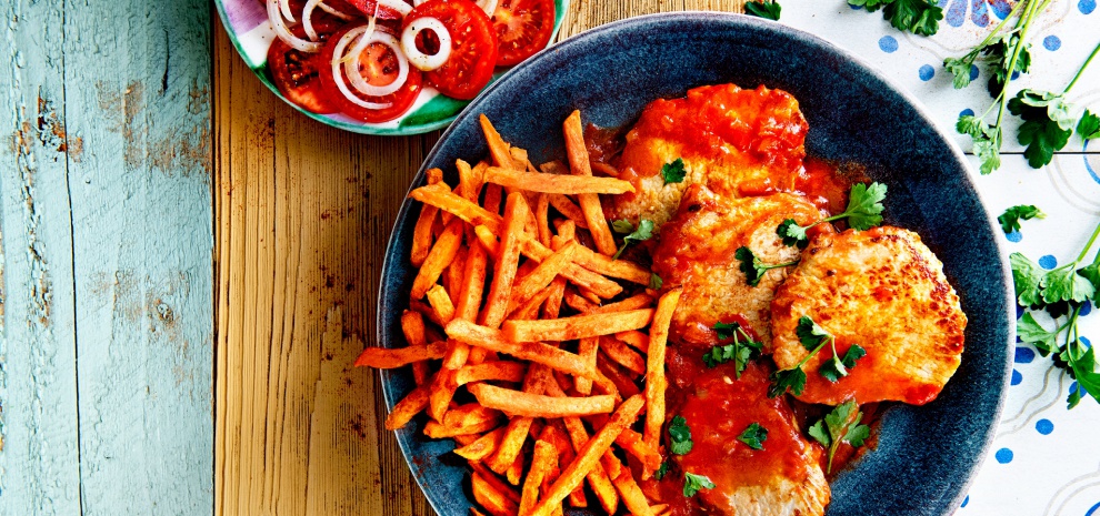 Schnitzel in piri-piri tomatensaus met gerookte zoete aardappelfriet