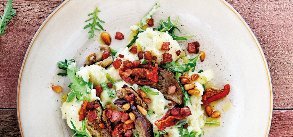 - Schep de aardappelpuree op 4 borden en verdeel de rest van het pancetta-groentemengsel, de rucola en tomaatjes erover. Bestrooi met de geroosterde pijnboompitten.