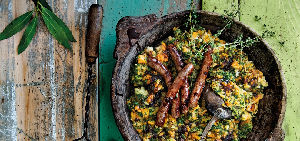Geroosterde pompoenstamppot met tijmchipolata’s