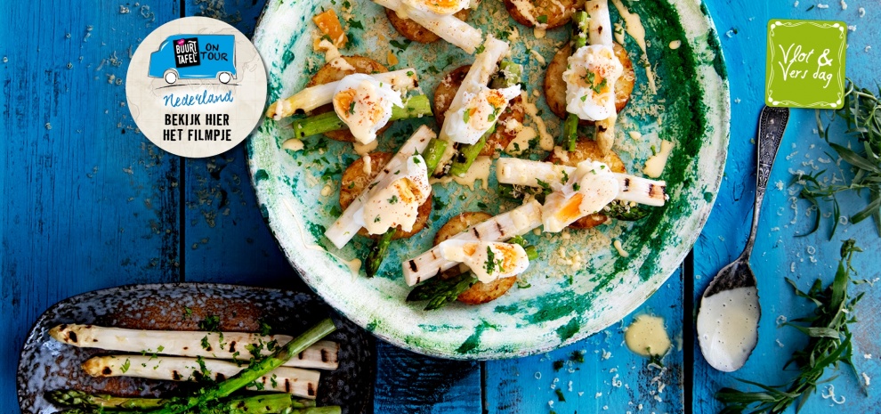 - Leg 8 rösti rondjes op een schaal. Verdeel er de gegrilde asperges over. Verwijder de folie van de eieren. Halveer de eieren en verdeel ze over de asperges. Lepel er wat hollandaisesaus over.