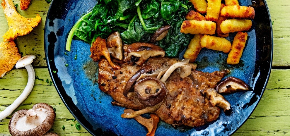 Italiaanse schnitzel met paddenstoelen, knoflookspinazie en aardappelkroketjes