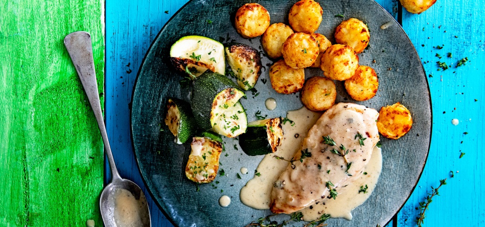 Kip met gorgonzolasaus, geroosterde courgette en rösti mini