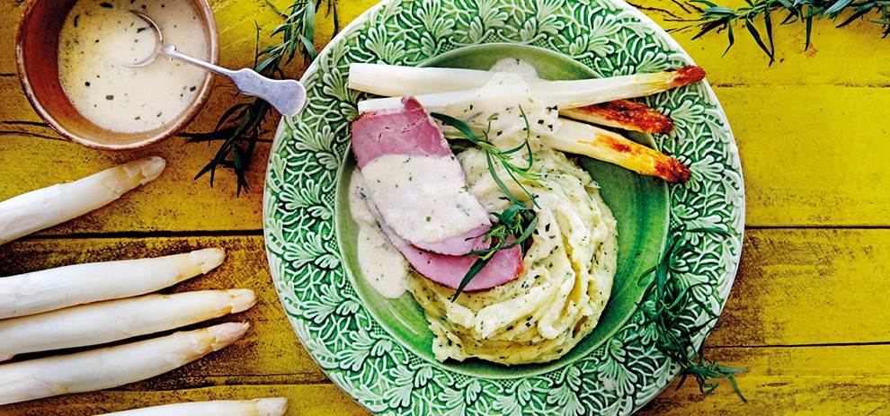 Kruidenpuree met geroosterde asperges en beenham in dragonsaus