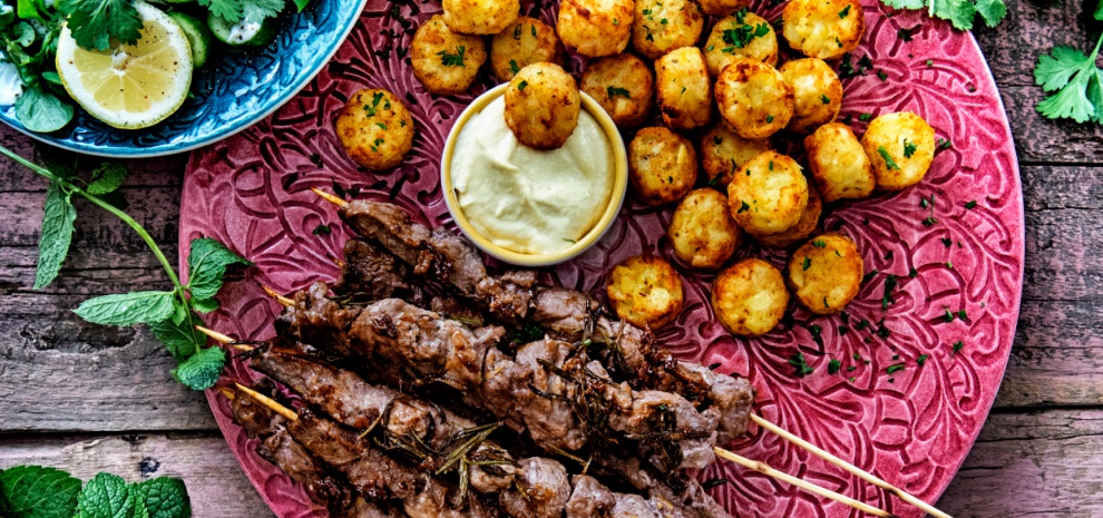 - Leg de lamsspiesjes op een schaal en schep er de rösti mini bij. Serveer met de salade.