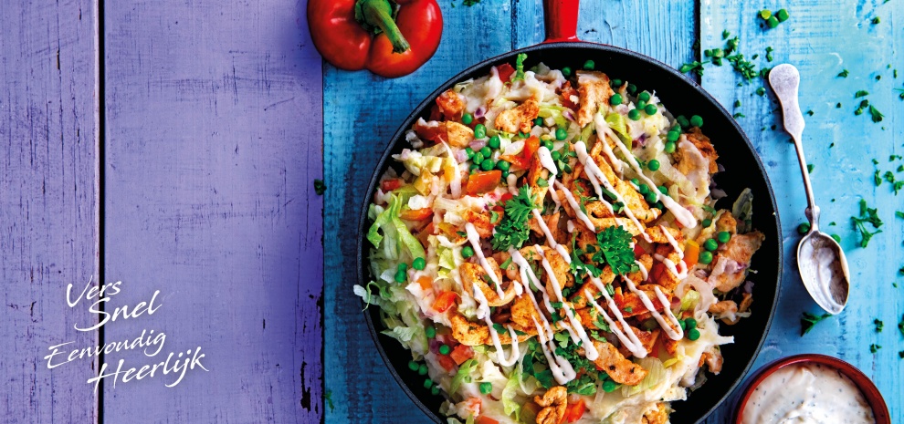 One Pan puree met kipshoarma, paprika en ijsbergsla