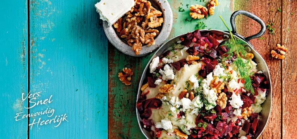 • Ultiem comfort op drukke dagen: een eenpanner met puree, biet, feta en walnoten.