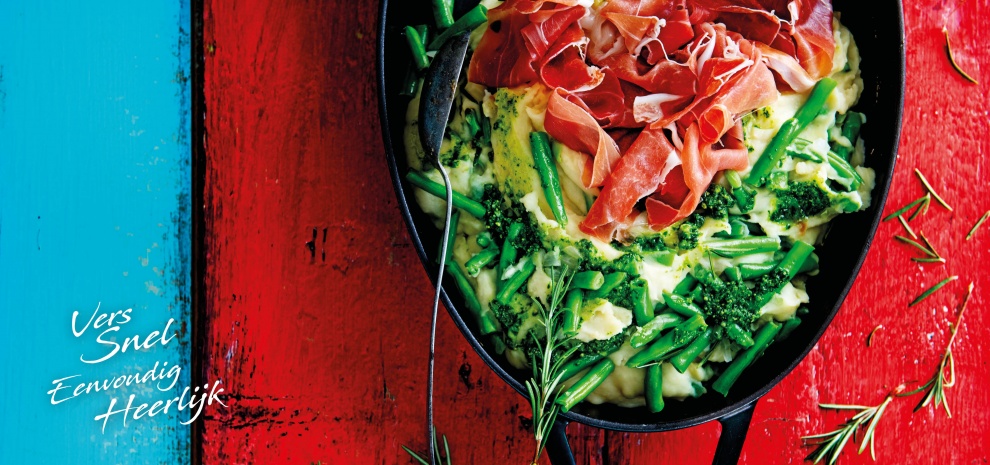 One Pan rozemarijnpuree met sperziebonen, pesto en parmaham
