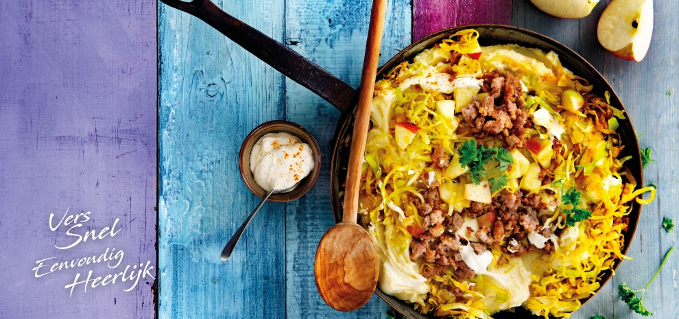 • Spitskool, kerrie, gehakt en appel is een gouden combinatie. Voeg romige puree toe en je maaltijd is helemaal af!