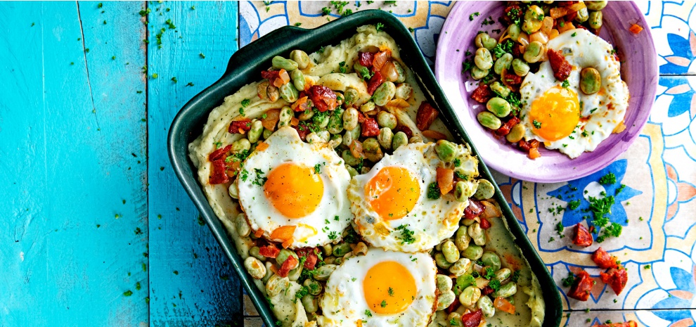 Ovenschotel met tuinbonen, kruidenpuree, chorizo en spiegelei