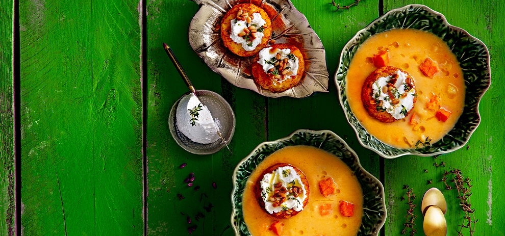 - Romige soep met bloemkool, zoete aardappel én knapperige croutons van röstirondjes belegd met ricotta, geroosterde pijnboompitten en tijm.