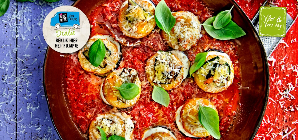 • Schenk de tomatensaus in de ovenschaal. Snijd van de laatste 2 tomaten ook 8 mooie plakken. Bouw 8 torentjes: begin met een plak tomaat bestrooid met wat Provençaalse kruiden. Leg er een plak aubergine, plak mozzarella en röstirondje op. Zet de torentjes in de tomatensaus. Verdeel de gegrilde groenten op de torentjes. Meng de panko met de laatste eetlepel olijfolie en zout en peper naar smaak. Bestrooi de torentjes met het broodkruim.