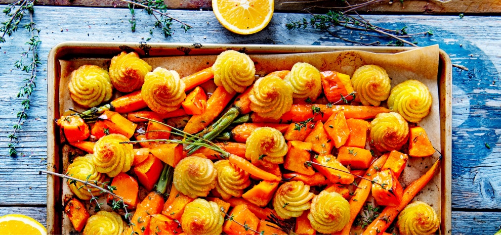 - Ook met kerst is een traybake ideaal! Gebruik je mooiste (gouden) bakplaat of schep de aardappeltorentjes met de gemarineerde groenten op een feestelijke schaal en bestrooi met wat extra tijm.