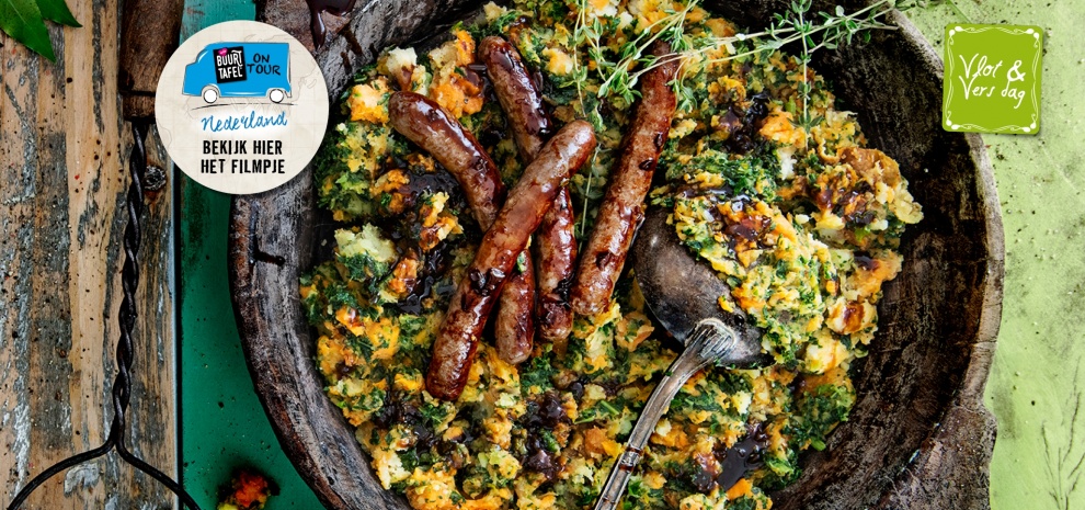 Verrassende Stamppot met zoete aardappel en chipolataworstjes