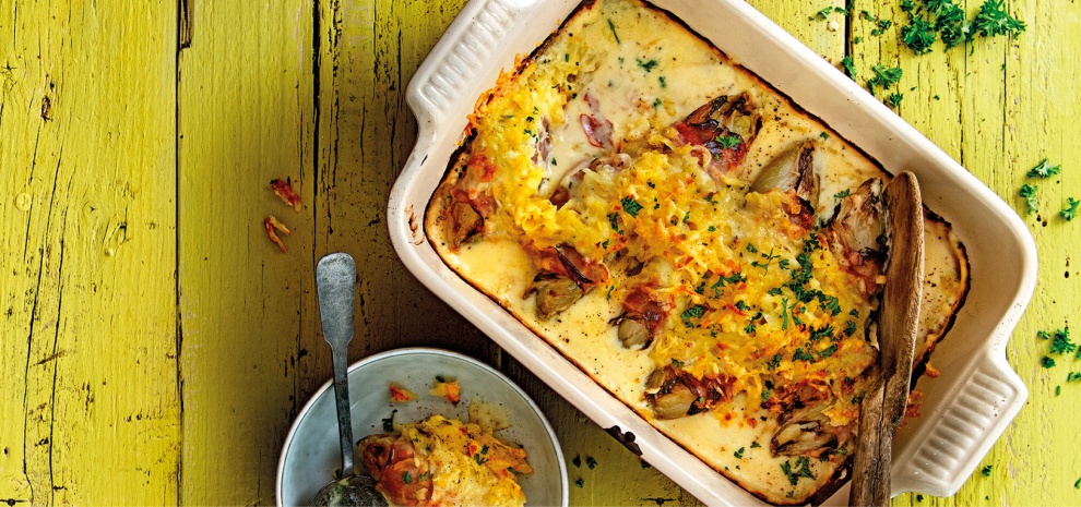 Witlofschotel met tijm-bierchamel en spekkroketjes