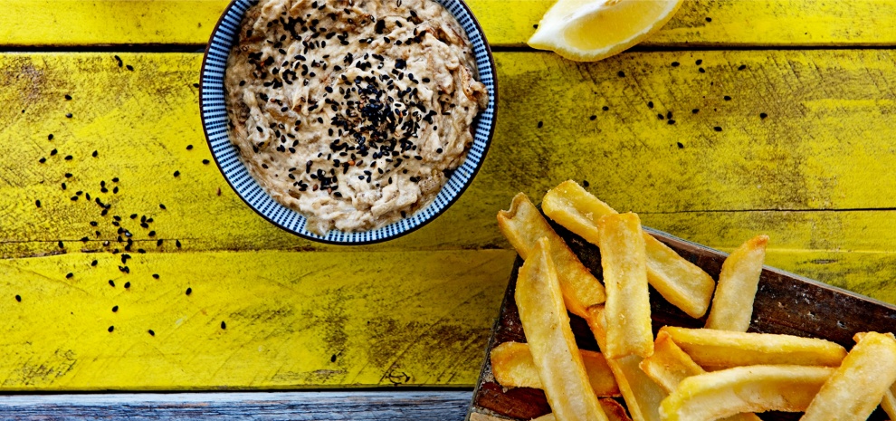 - Hak de knoflook fijn en voeg toe. Voeg de sesampasta toe, knijp het sap van een citroen in de dip.
