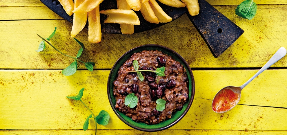 - Doe de bonen met de olijfolie, de knoflook, de komijn, 1 eetlepel chipotlesaus en de blaadjes van het takje munt in de hakmolen. Pureer tot een grove dip.