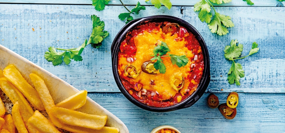 - Hak de koriander grof en bestrooi de warme cheddar-nachodip ermee. Serveer de friet met de dip.