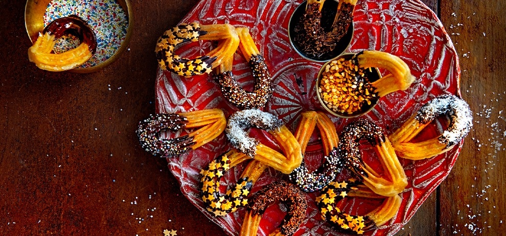 - Bestrooi de churros met kaneelsuiker en versier de toren met chocoladesterren en/of parels. Serveer met de warme chocoladesaus.