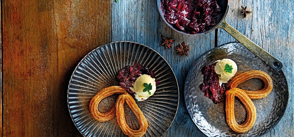 - Vergeet de klassieke ijscoupe met warme kersensaus, deze feestdagen verras je je gasten met krokante churros met warme cranberrycompote en roomijs.