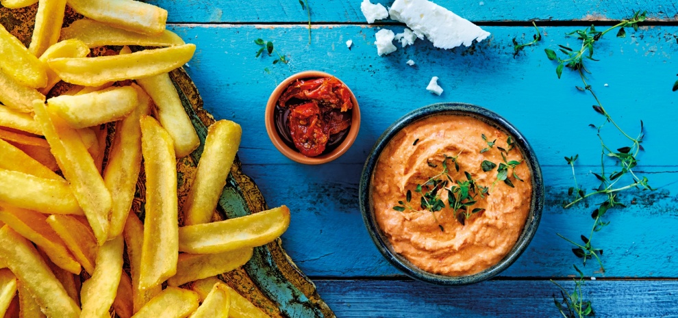 - Bereid de friet volgens de aanwijzingen op de verpakking en serveer met de dip.