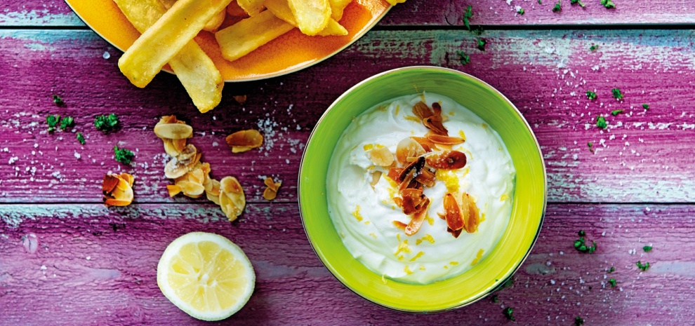 - Bereid de friet volgens de aanwijzingen op de verpakking en serveer met de dip.