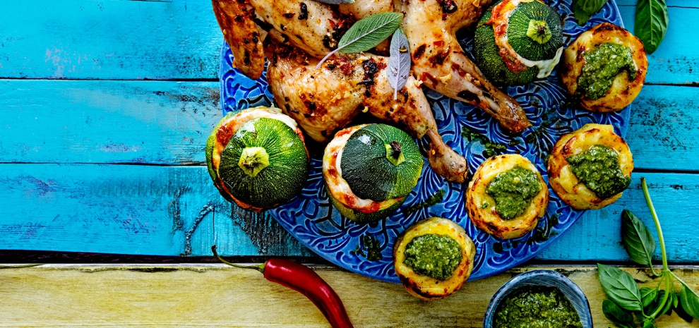 - Leg de kip op een grote schaal. Zet er de bolcourgettes en de gratins bij. Schep op elke gratin een beetje pesto. Serveer de rest van de pesto er apart bij.