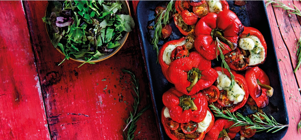 - Schep de puree in de paprika’s. Verdeel er het gehaktmengsel over. Leg de kapjes weer schuin op de paprika’s.