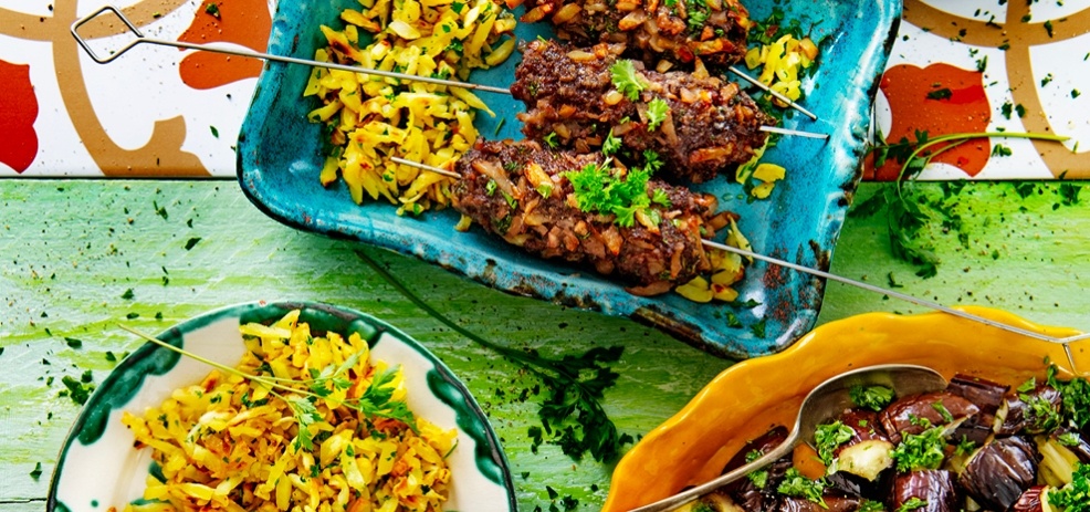 - Schep de resterende kruiden door de rösti en breng op smaak met zout en peper. Serveer de keftaspiesen met de auberginesalade en de kruidenrösti.