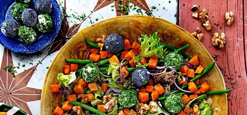 Maaltijdsalade met zoete aardappel, haricots verts, geitenkaasballetjes en walnootnougatine