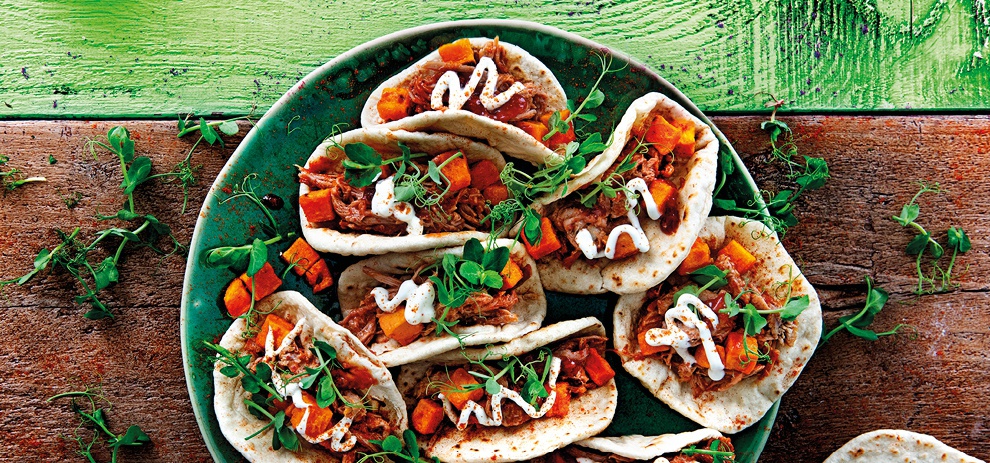 - Verwarm de miniflatbreads eventueel op de barbecue, tot ze warm maar niet knapperig zijn. Vul ze met de pulled pork en de zoete aardappelblokjes. Schep er een beetje Griekse yoghurt op en garneer met erwtencress.