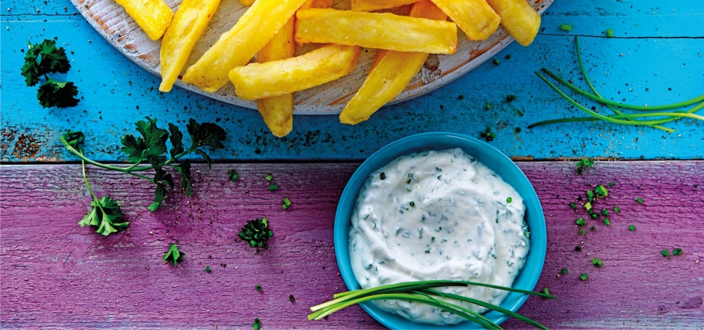 - Bereid de friet volgens de aanwijzingen op de verpakking en serveer met de dip.