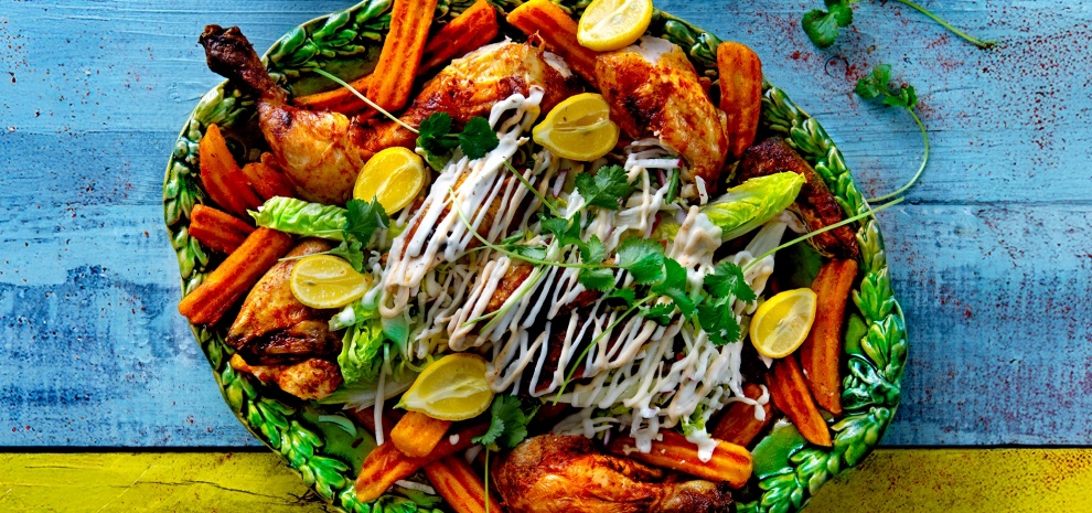 - Met zo’n goudbruin geroosterde kip lijkt het alsof je uren in de keuken je best hebt gedaan voor je gasten. Extra feestelijk met partjes frisse (mini)citroen en elegante takjes koriander.