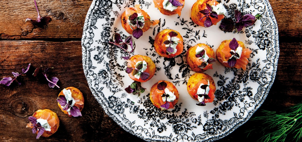 - Leg de rösti mini op een schaal. Verdeel er de zalmreepjes over. Schep een beetje dillecrème op de zalm en garneer met de cress of tuinkers.
