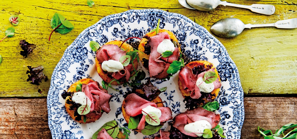 - Leg de röstirondjes op een schaal. Verdeel er de sla en de rosbief over. Schep op elke rösticrouton een beetje bearnaisemayonaise.
