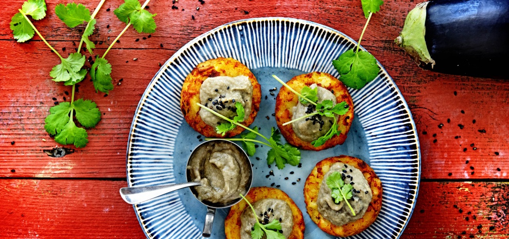 - Leg de röstirondjes op een schaal. Schep er wat baba ganoush op. Bestrooi de hapjes met het sesamzaad en de blaadjes van de takjes koriander.