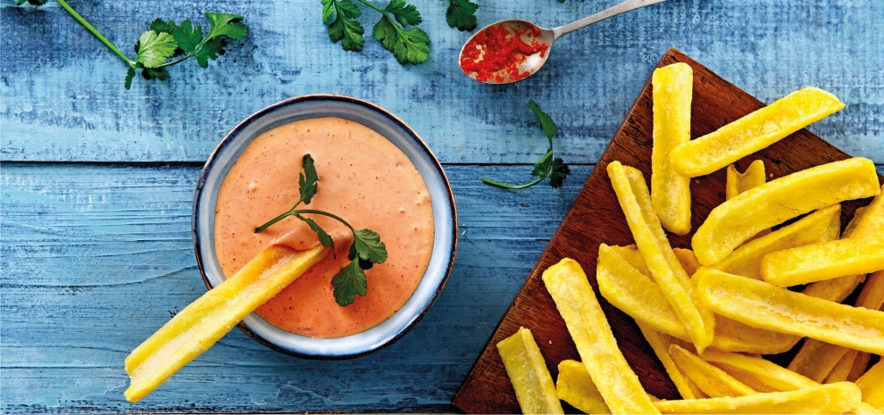 • Bereid de friet volgens de aanwijzingen op de verpakking en serveer met de dip.