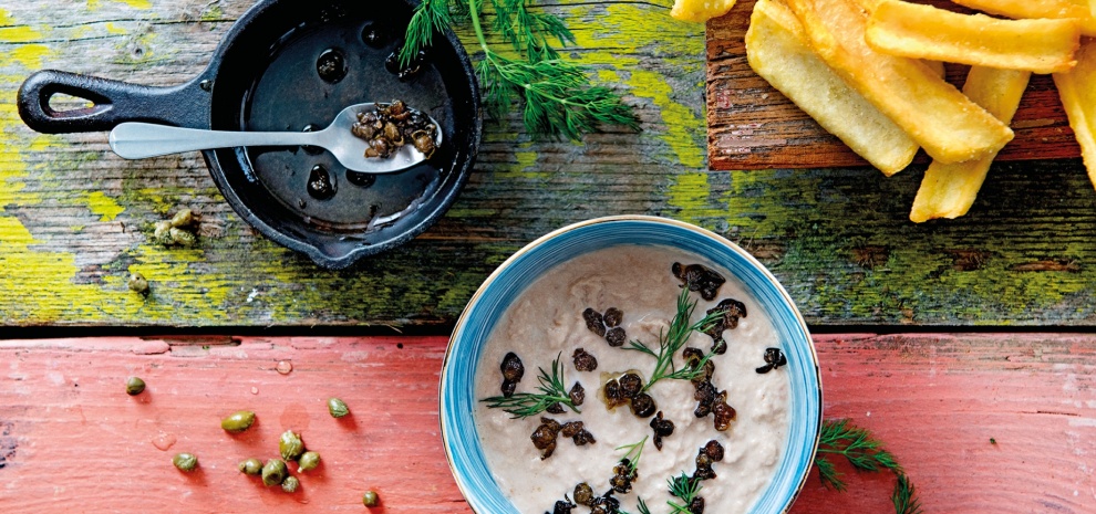 - Schep de tonijndip in een schaaltje en bestrooi met de krokante kappertjes.
