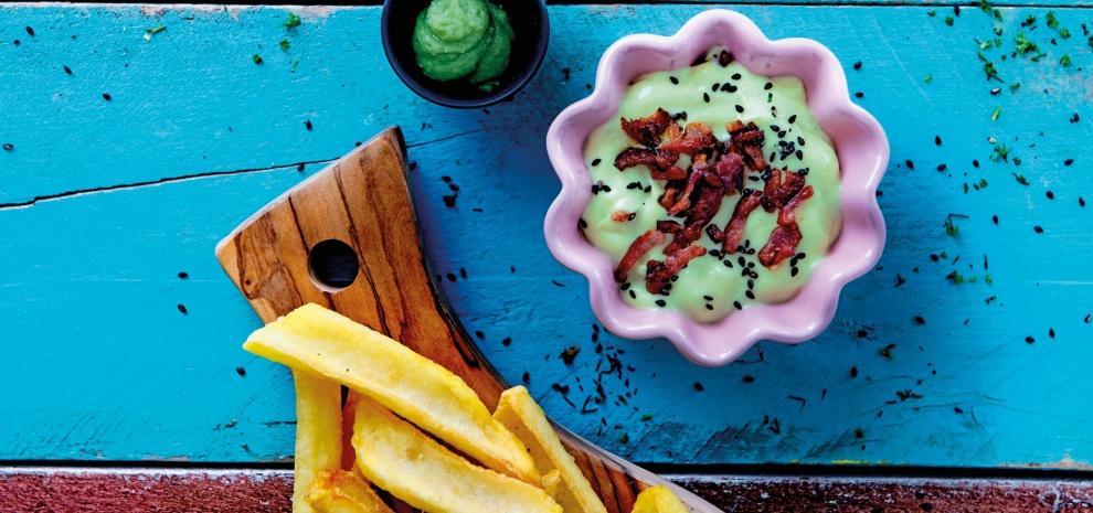 - Schep de wasabi-baconmayonaise in een schaaltje en bestrooi met het sesamzaad.